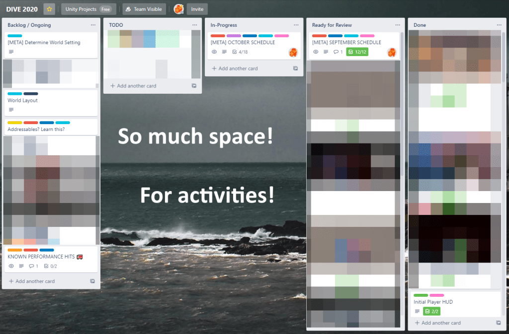 The UI block did involve a fair bit of work, though. With two major systems, three ancillary systems, an event system rework, and a capstone to finalize the month, September was the busiest month to-date by far. Looking at the Trello board checklist, I keep thinking, “wait… these were all this month… ?”