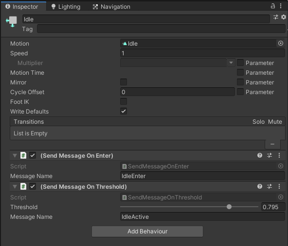 On a side note, I have been sort of obsessed lately with the StateBehaviour feature within Unity’s Animator system. Basically, it’s a kind of Behaviour that you can attach to individual state blocks within an Animator layer.